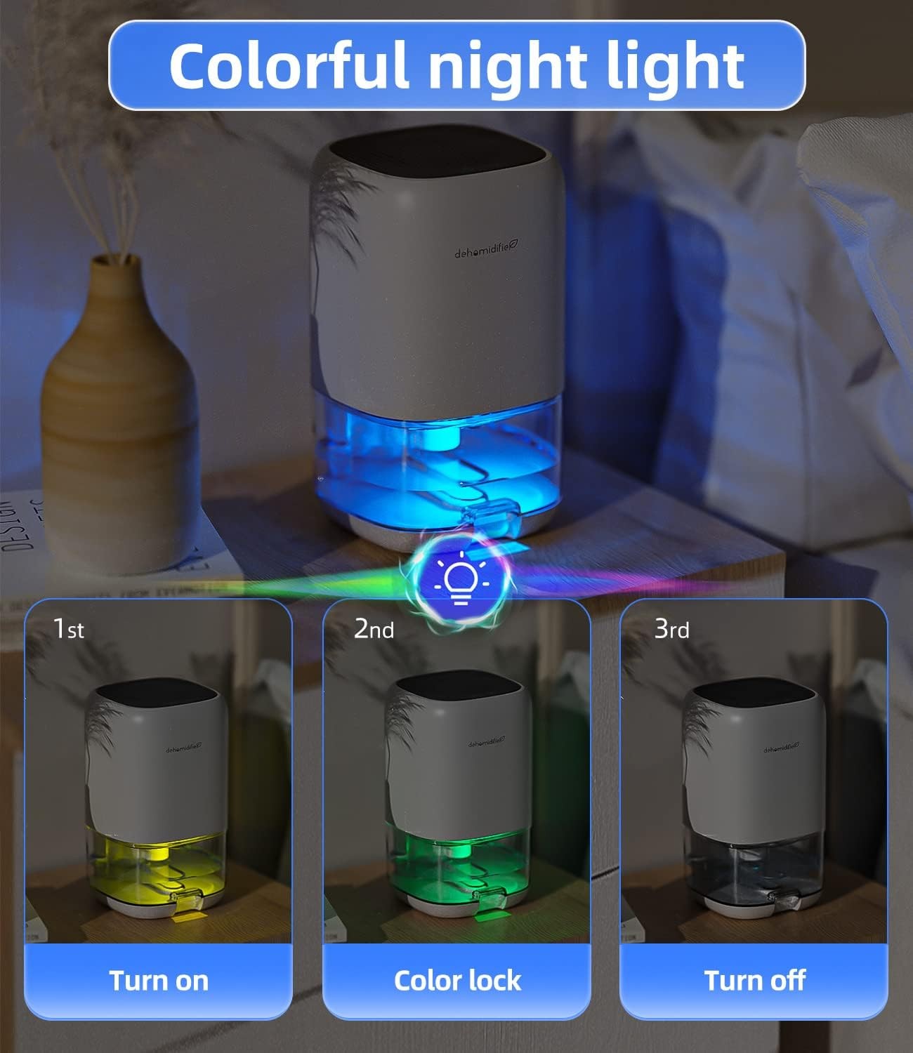 Small Dehumidifiers with Colorful Light: There is a separate light button, which can emit 7-color romantic atmosphere lights for you, and the ultra-quiet operation (28dB) creates a comfortable and peaceful environment for your bedroom and office.