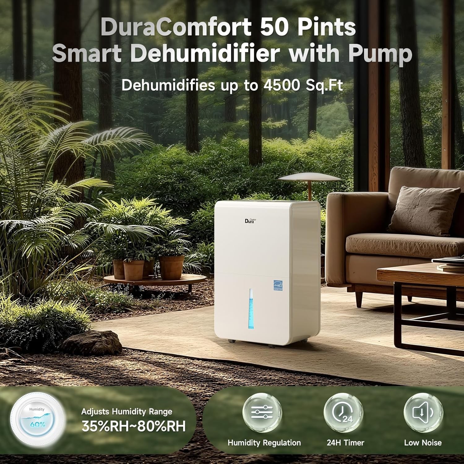 Large Coverage —— Removes up to 50 pints/day, ideal for basements, bedrooms, bathrooms, kitchens, garages, and more. Adjustable humidity from 35%–80% RH.