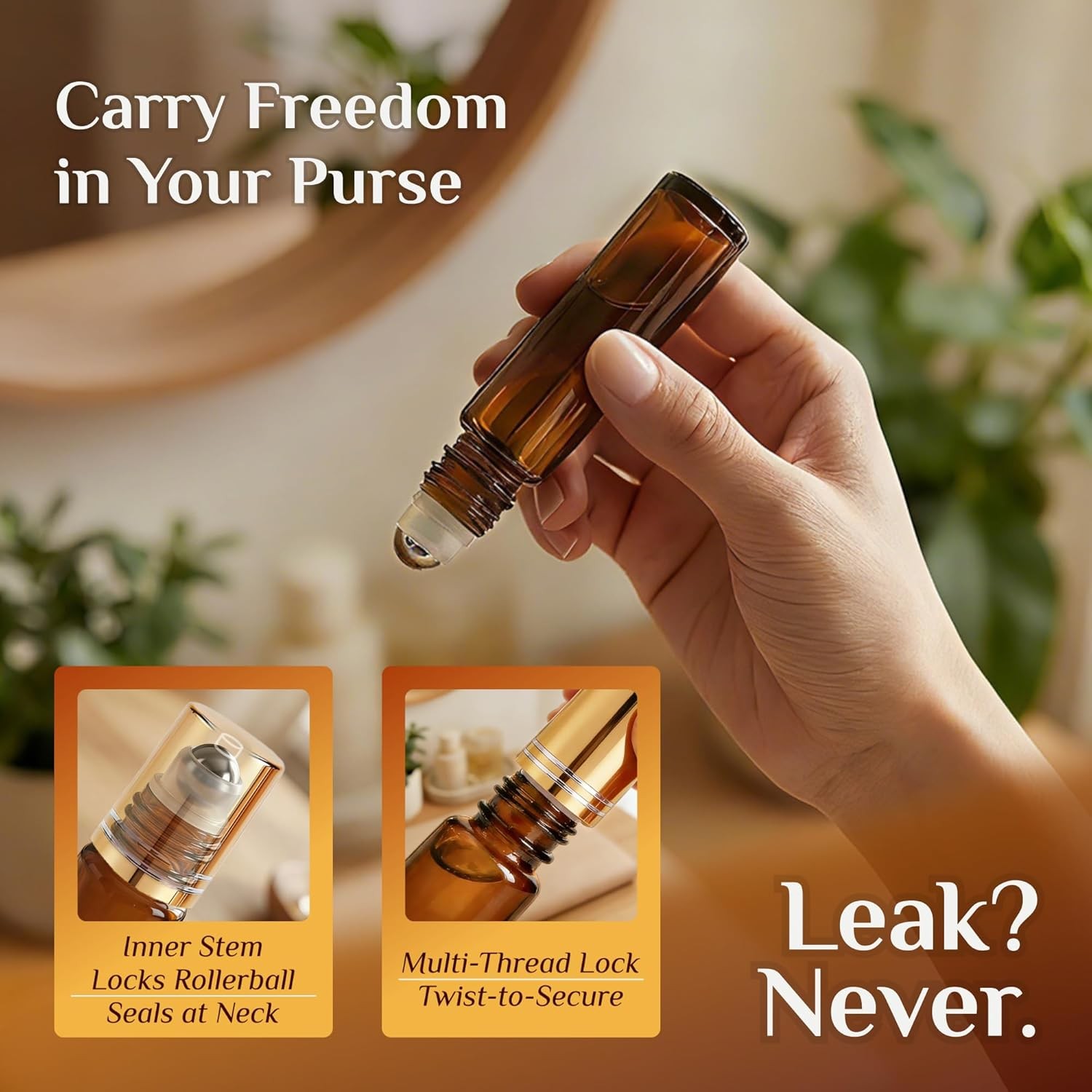 Leak-Proof Design: The amber glass essentialoil roller bottles with dual metal caps, screw bottle mouth and tightness stainless steel roll balls prevents any sort of leakage.