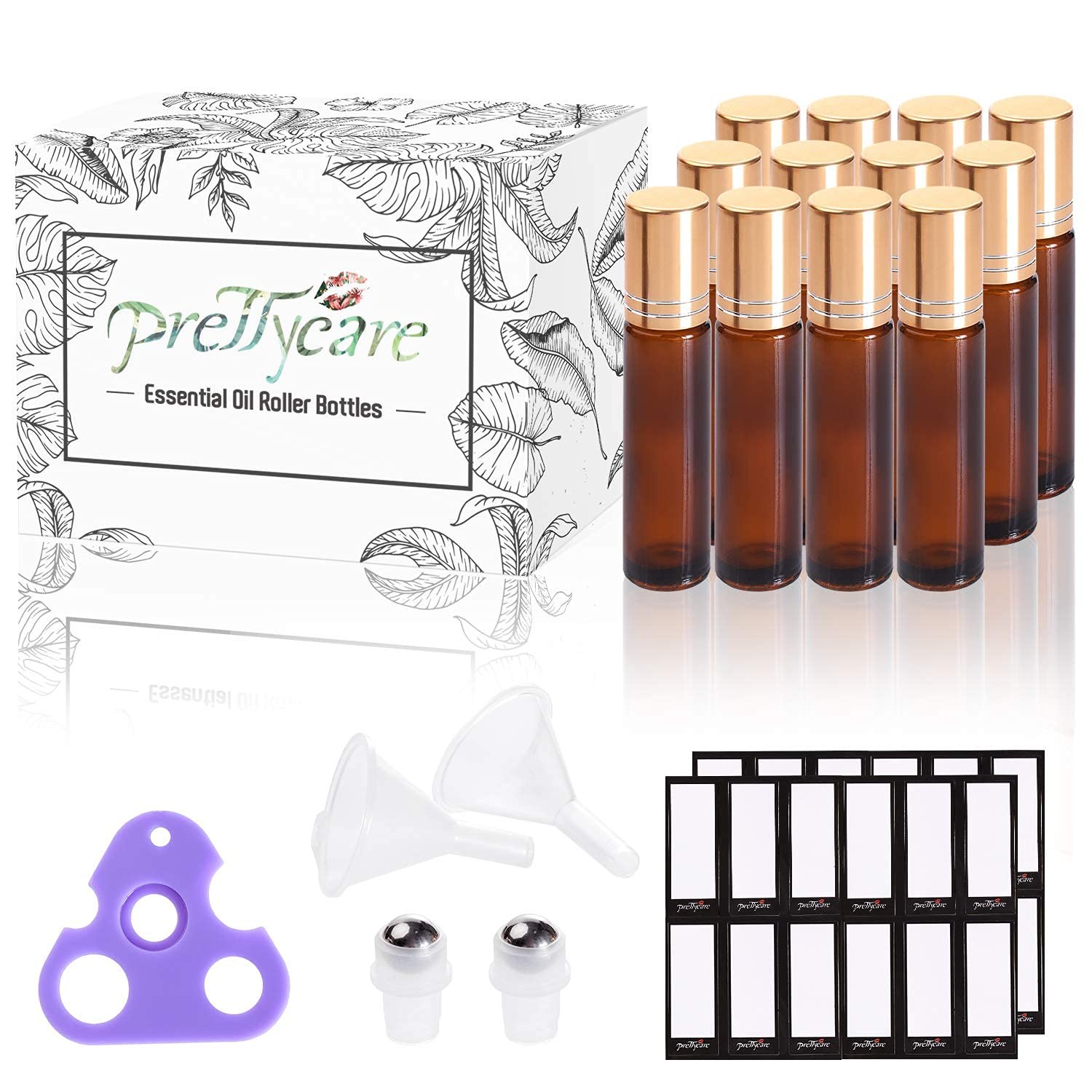 PrettyCare 12 Pack, 10 ml Essential Oil Roller Bottles with Stainless Steel Roller Ball - Refillable Leak-proof Empty Thick Amber Glass Roll on Bottles with Metal Caps for Travel, Perfume