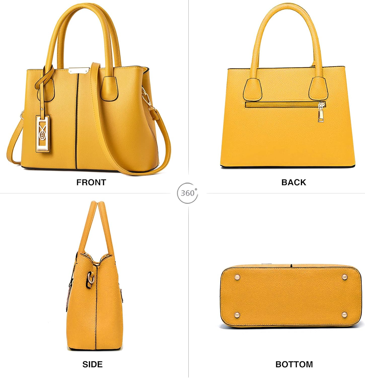 FEATURES: Decorative Gold-tone Hardware, Zip-pockets in Middle and Back, Removable Shoulder Strap, Flat Studded Bottom.